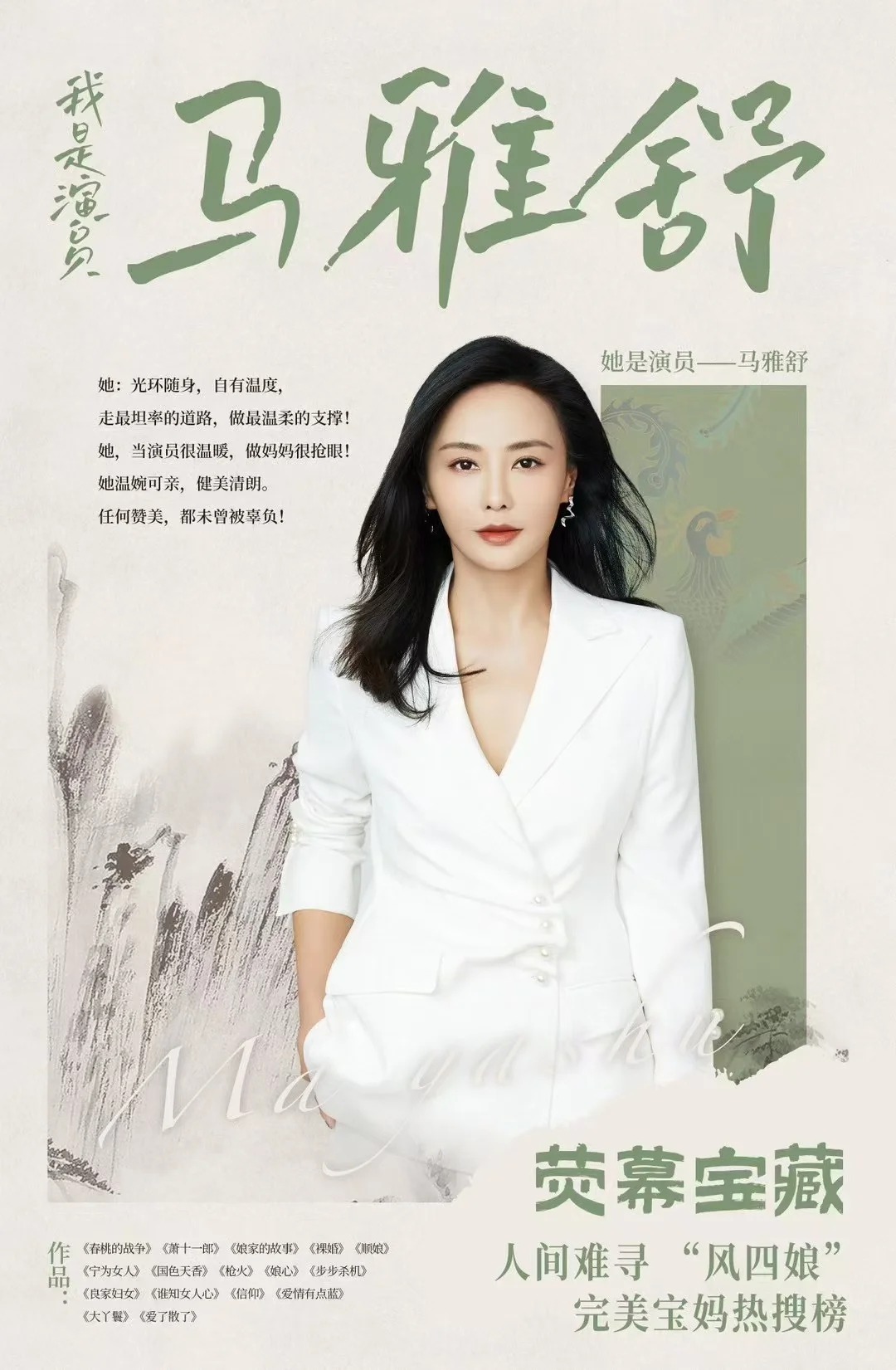 马雅舒的成长之路,是一部女性艺人的多元发展史。从舞蹈演员到古装女神,从影视剧主角到综艺话题人物,她用二十余年的时间诠释着对表演的热爱和对生活的探索。无论是清丽的白莲花、飒爽的风四娘,还是真实的马雅舒,她都在用最真诚的方式展现自我。这位 “古装女神” 的人生仍在继续,相信她将为观众带来更多真实与感动。